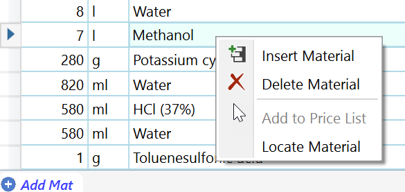 - The Add to Price List option adds the currently selected material to the active price list, if not yet present. It is disabled if more than one material is selected, of if the material already is present in the price list.