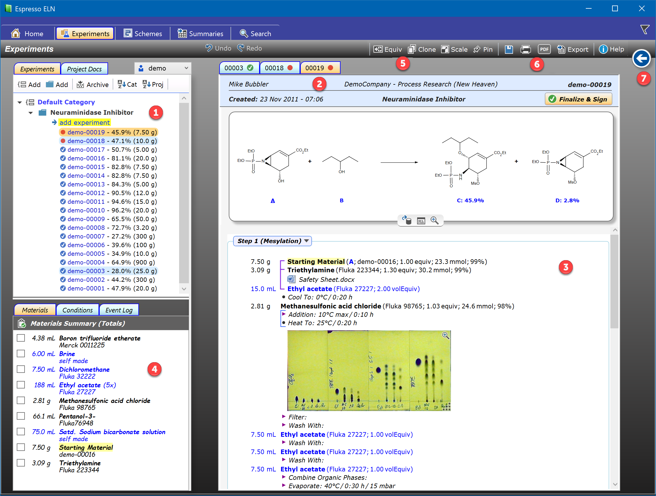 See the step-by-step tutorial on how to create an experiment to learn how to work with experiment protocols. Each experiment tab contains an experiment protocol, which can be finalized or unfinalized (in progress). Finalized experiments are locked and read-only, but allow access to their embedded PDF documents, if present, and let the reaction editor open (but not modify) their reaction sketches.