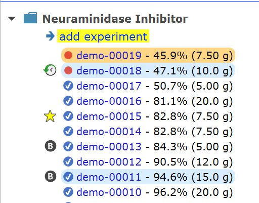 Contains a list of all project projects and experiments of your ELN, organized into project categories. If nothing else is specified, the elements are ordered by reverse date, i.e. the most recent ones are always on top. If desired, project categories and/or projects can be sorted alphabetically using the toolbar buttons on top of the experiments tree. By default, they are sorted by descending date. Each project contains a link below its header for adding experiments (see step-by-step tutorial on how to create an experiment from scratch). Context menus are available for the experiment entries (right-click). The experiment entries contain yield and scale information and following conventions apply: